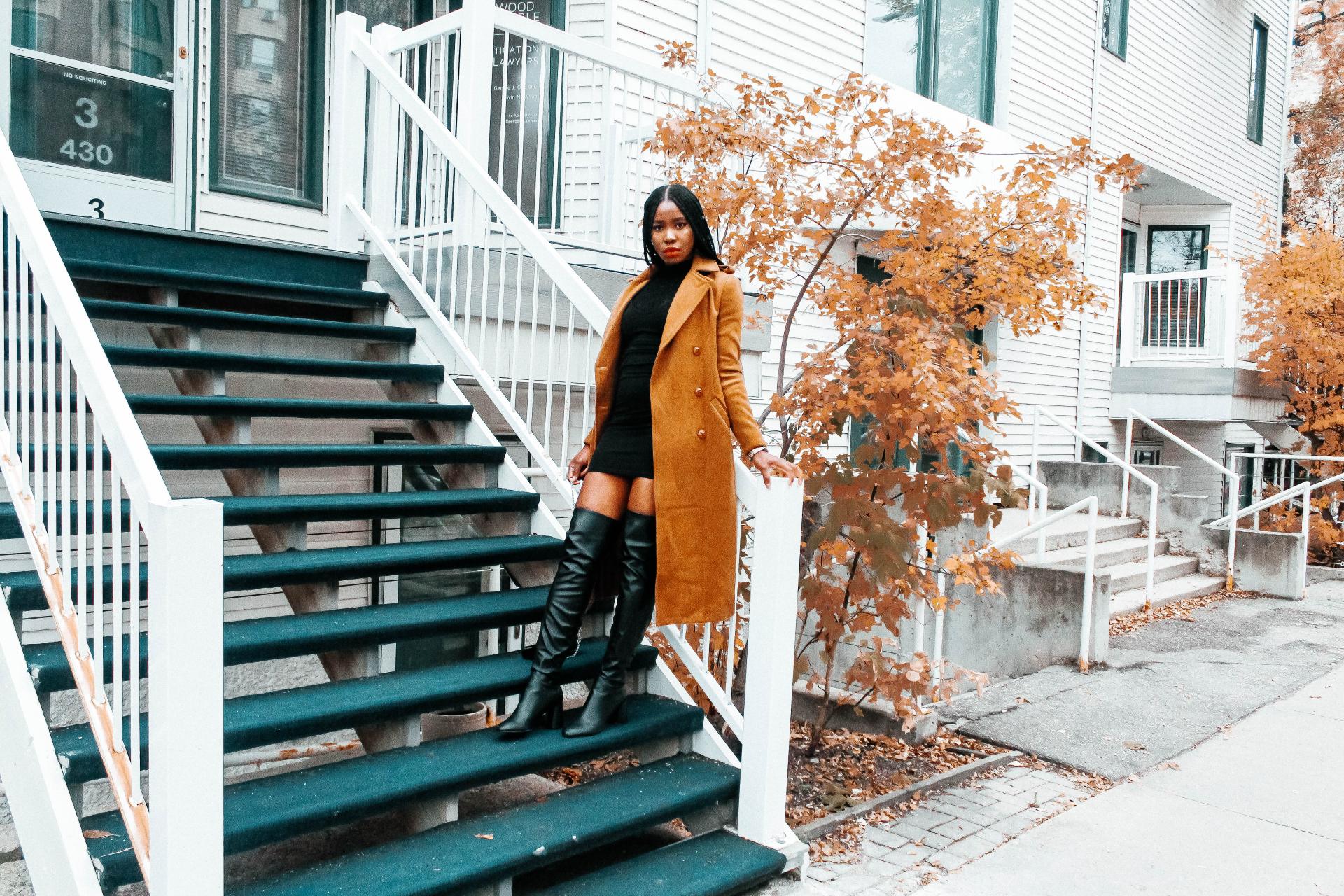 Inspired by one of fashion week’s greatest most popular trends; the long structured coat look paired with statement boots, I got all dressed up for the fall. I paired my favorite fall tan coat with a simple all black look. I’ve officially mastered the art of layering to create my perfect look and for this look, I did just that. I paired my black turtle neck sleeveless top with a black body-con dress . I finished the look with these black long boots and a mini bag.