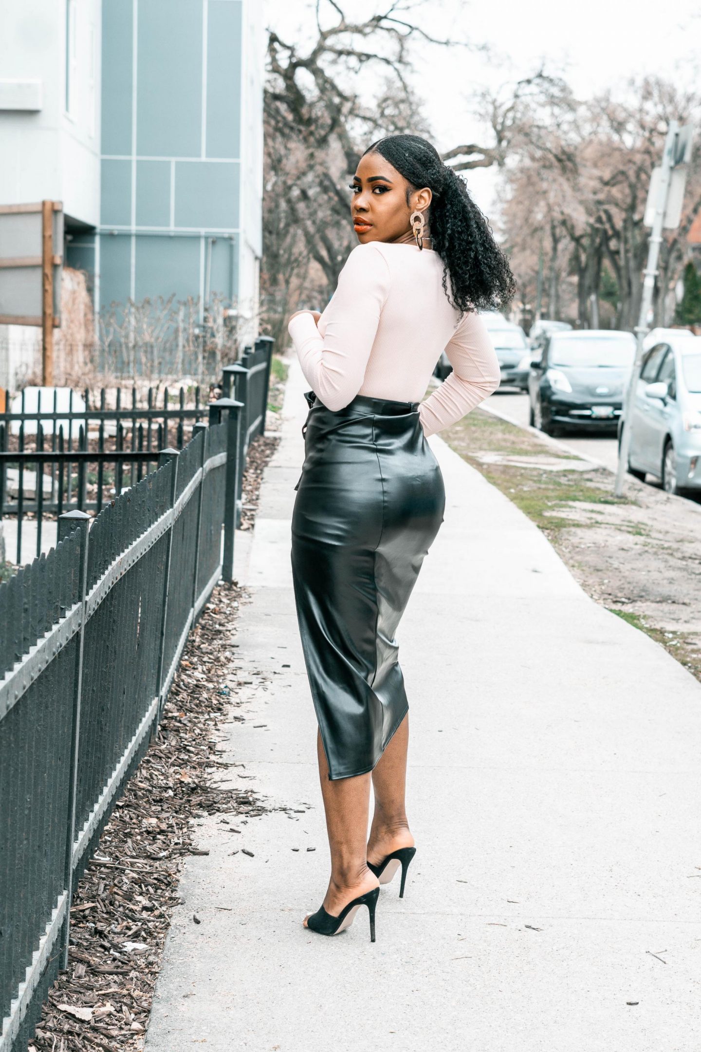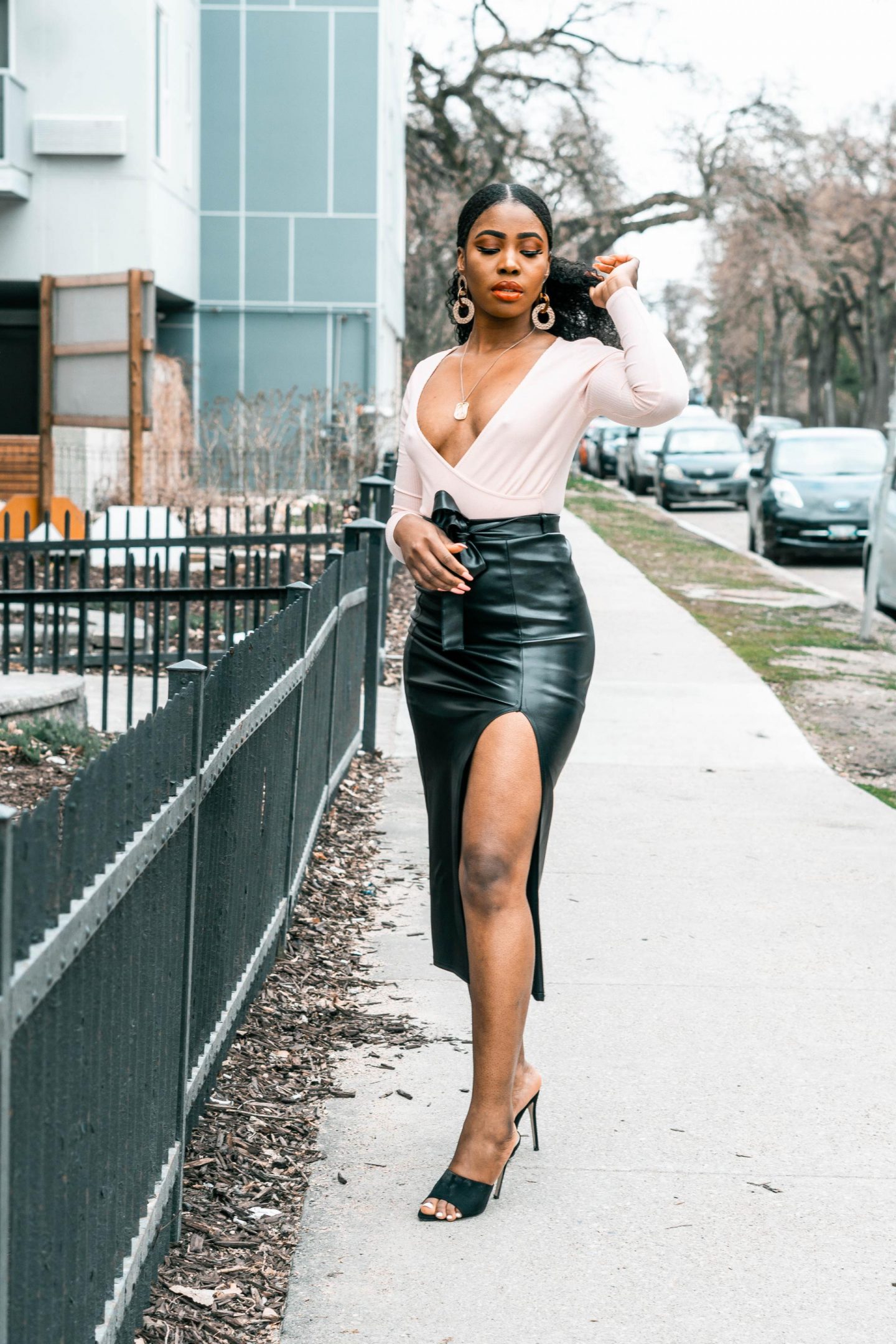 I know oversized skirts and sneakers are the new IT girl trend right now, but you can glam it up a bit for brunch with mom. I’m switching out my graphic tees for a pink low cut body suit and my oversized midi skirts for this fitted Femme Luxe Finery Black PU High Split Midi Skirt (Piper).